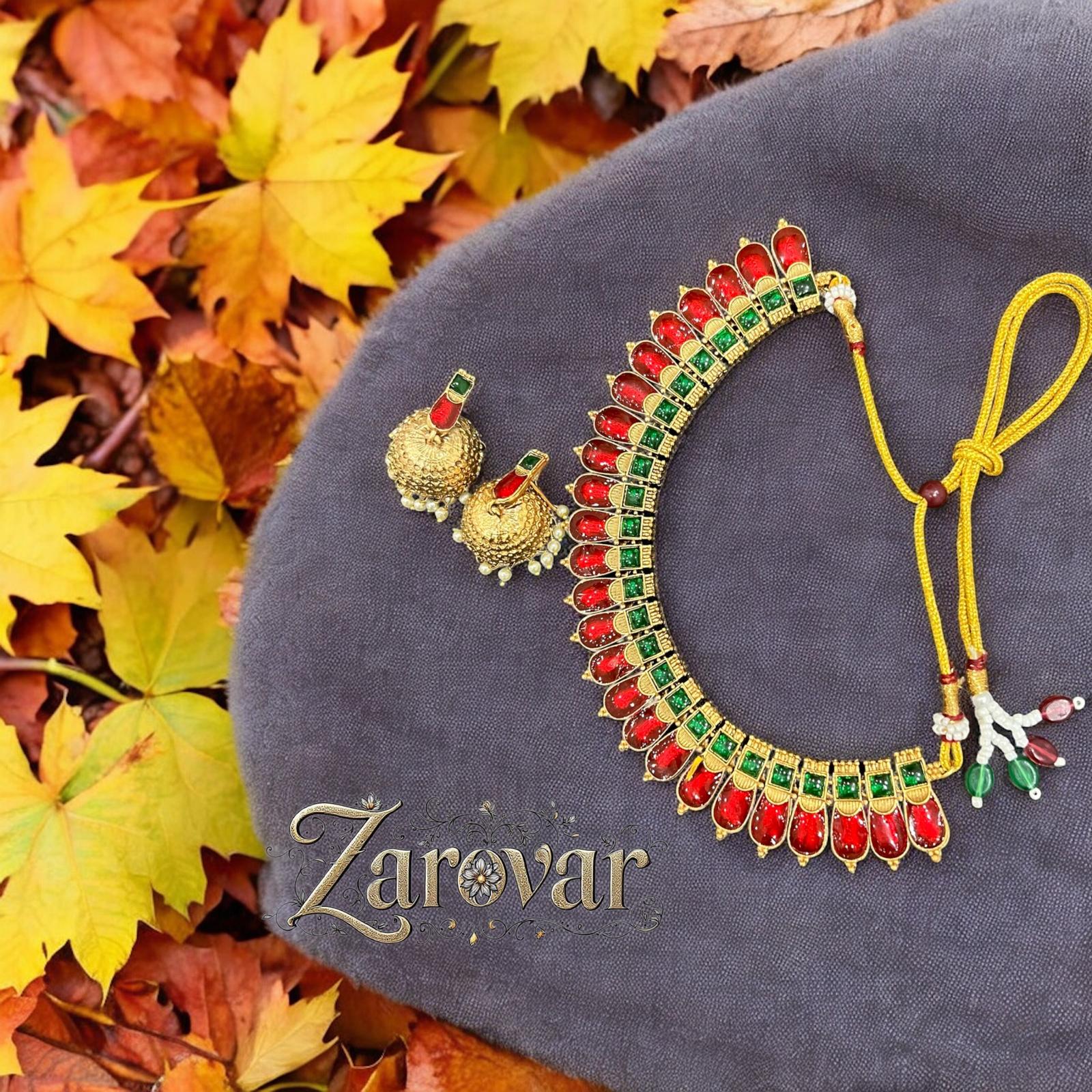 Elevate your style with this exquisite Premium Quality Enamel Palakka Necklace, beautifully paired with matching jhumka earrings. Crafted from a durable copper-brass alloy base, this set features a subtle matte finish that enhances its vibrant enamel detailing.