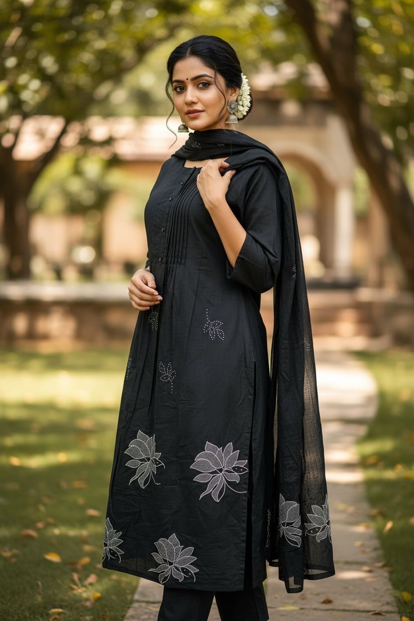 Black- Floral Printed Round Neck Anarkali Kurta With Trousers & Dupatta
