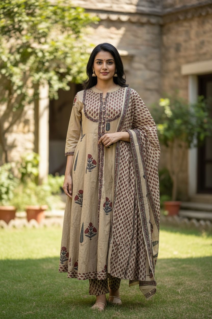 Embrace effortless grace this season with our Printed Anarkali Kurta Dupatta Set, beautifully adorned with hand Katha embroidery and delicate sequin and button work.