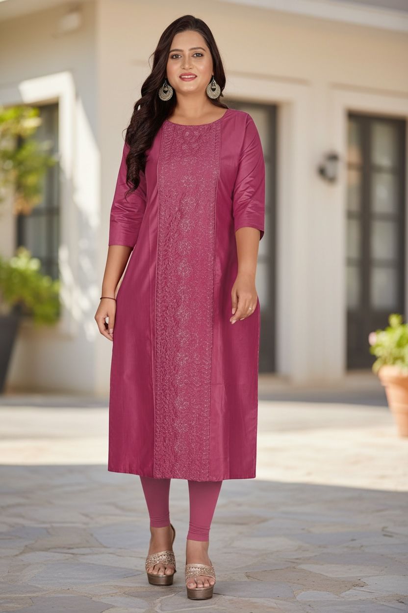 Step into effortless elegance with this Chanderi A-line Kurti, designed with a refined blend of comfort and style. Crafted from premium Chanderi fabric with a soft cotton lining, this kurti features a flattering V-neck, 3/4 sleeves, and subtle embroidered detailing that adds a touch of sophistication.